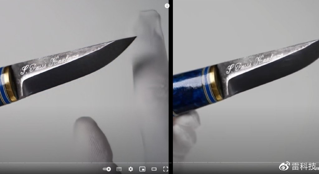 首先是开箱视频,如图所示,在开启视频超分辨率技术后,刀身的图像质量有了显著提高,不但有效抑制了噪点和锯齿的产生,就连刀上面刻下的署名也变得清晰许多。